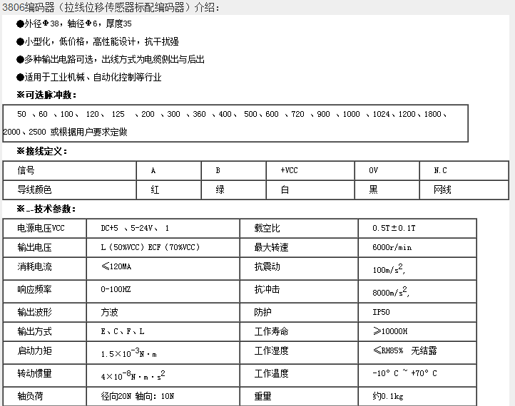 3806電梯位移編碼器把角位移或直線位移轉換成電信號,前者稱為碼盤,后者稱為碼尺。按照讀出方式編碼器可以分為接觸式和非接觸式兩種;按照工作原理編碼器可分為增量式和絕對式兩類。